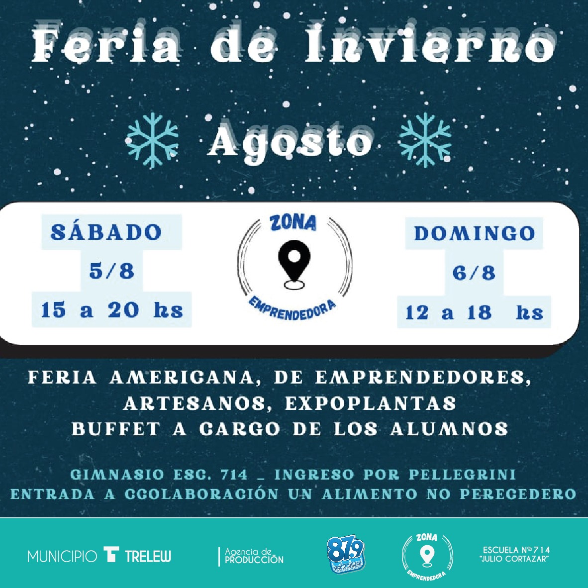 La Municipalidad de Trelew, a través de la Agencia de Desarrollo Productivo y Social, realizará una nueva Feria de Invierno. Se trata de un evento que reunirá a los grupos asociativos de emprendedores de la ciudad como Zona Emprendedora, el Arte de Emprender y Explo-Plantas. En esta ocasión, los emprendedores trabajarán junto a los alumnos de la Escuela n° 714, en un encuentro que permitirá el intercambio y promoción de los productos locales.