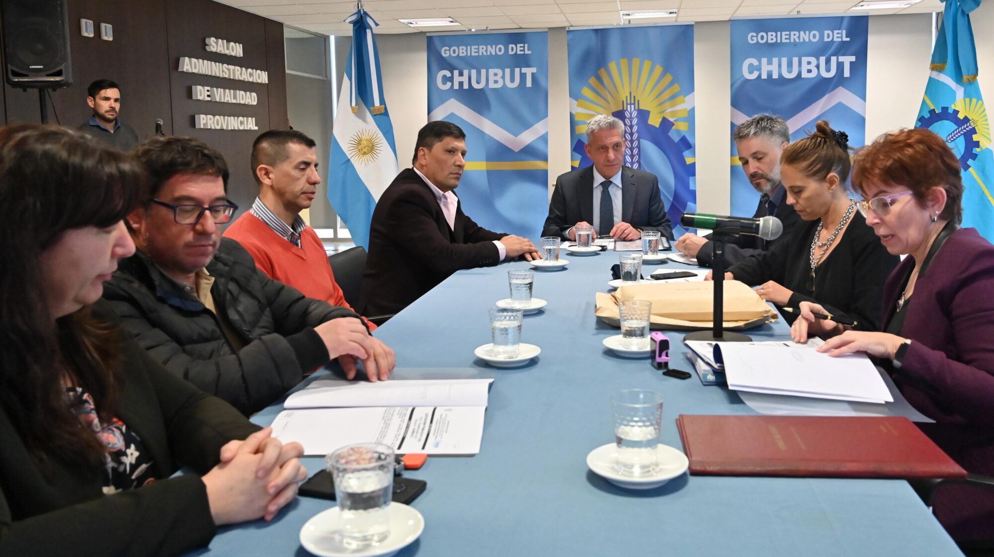 El acto, que tuvo lugar en el Salón de Usos Múltiples de la Administración de Vialidad Provincial (AVP), fue encabezado por el gobernador Mariano Arcioni, quien estuvo acompañado por el ministro de Desarrollo Social, Familia, Mujer y Juventud, Luis Aguilera; los subsecretarios Obras Municipales, Sergio Ramón; de Obras Públicas, Mónica Martínez Carpio, de Planificación, María Lorena Lavecchia; de Desarrollo Humano y Familia, Elías Silva; el director general de Obras Públicas, Alejandro Asensio; y el titular de la empresa Titan S.A, Martín Santos Chaile.