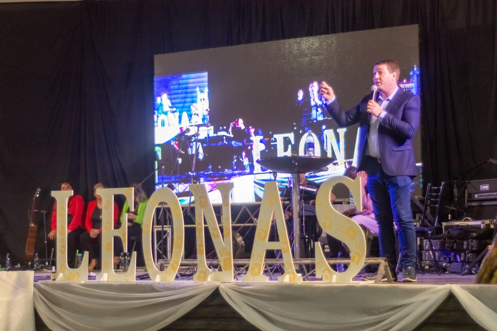 El intendente de Rawson, Damián Biss, participó el sábado por la tarde de la apertura del evento cristiano “Pacto de Leonas”, que reunió a una multitud en el Gimnasio Municipal “Héroes de Malvinas” de Playa Unión.