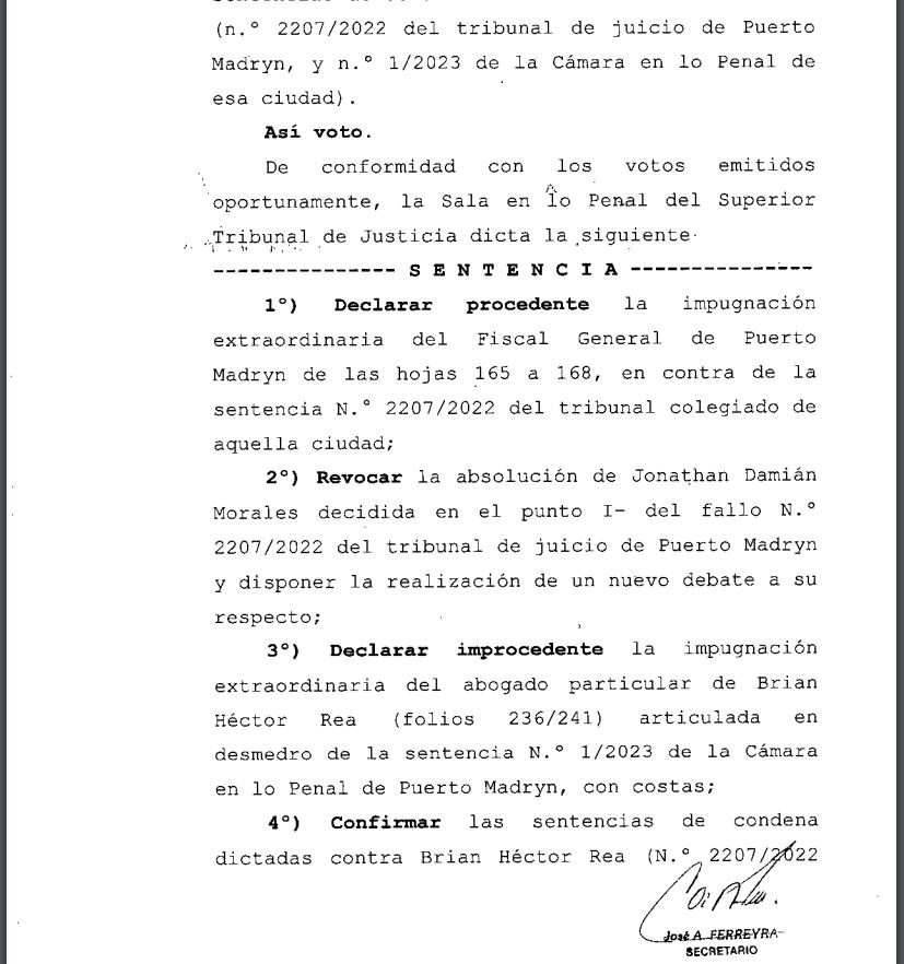 “En definitiva, sobre la base de los hechos fijados, la absolución resulta desacertada. Cabe efectuar el reenvío para que se produzca un nuevo juicio con relación a Jonathan Morales, a fin de determinar el alcance y las implicancias jurídicas de su intervención en el evento”, detalló el ministro Alejandro Panizzi en su voto.