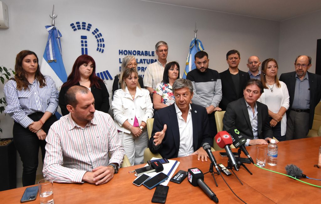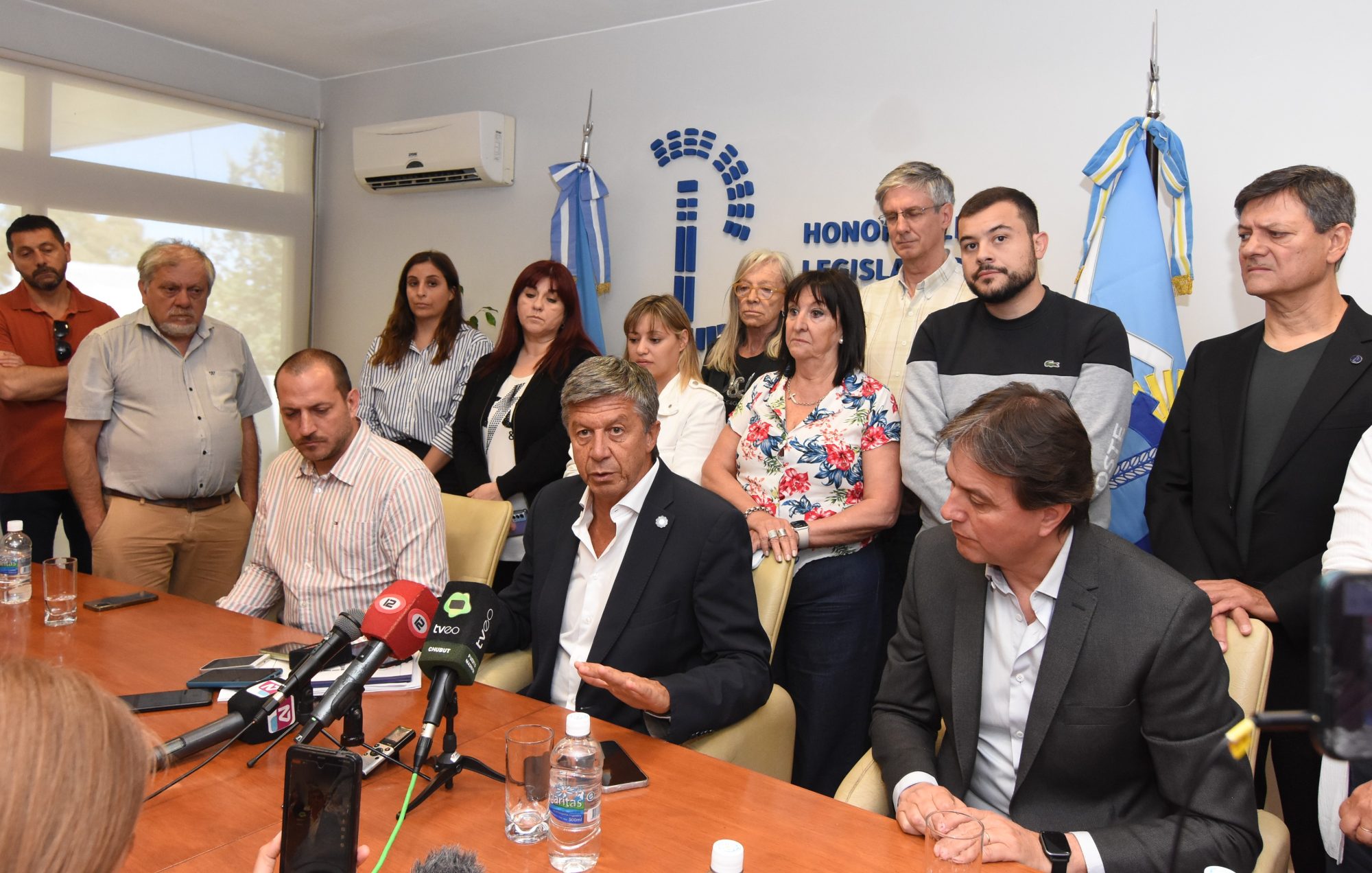 La conferencia de prensa se realizó en la sala de audiencias de la Presidencia de la Honorable Legislatura del Chubut, donde Menna estuvo acompañado por los 16 diputados del bloque oficialista, incluidos Luis Juncos, vicepresidente primero de la Cámara, y Daniel Hollmann, presidente de la bancada.