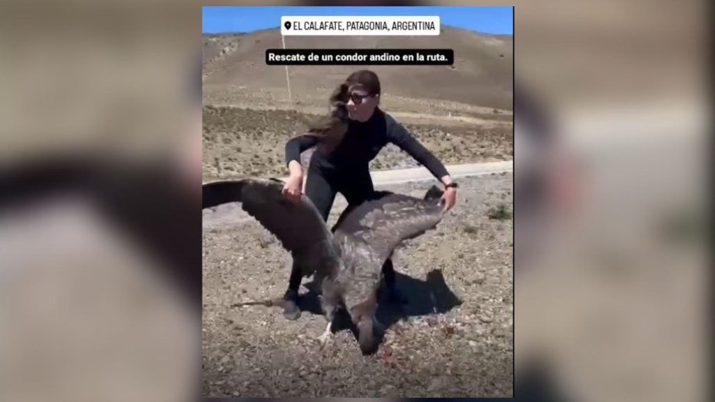 Una mujer rescató a un cóndor andino, que al intentar levantar vuelo chocó con un motociclista, en la ruta que une las ciudades santacruceñas de El Calafate y Río Gallegos, en un episodio que trascendió este jueves, cuando la protagonista del hecho compartió una foto y un video en redes sociales.
