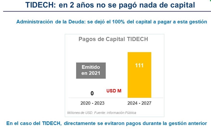 El pago de los poco más de 111 millones de dólares del Tidech serán en forma trimestral a partir del mes 27 desde la fecha de la emisión. De esta manera, la cuota comenzará a desembolsarse en febrero de 2024, ya con Ignacio Torres al mando del nuevo Gobierno.