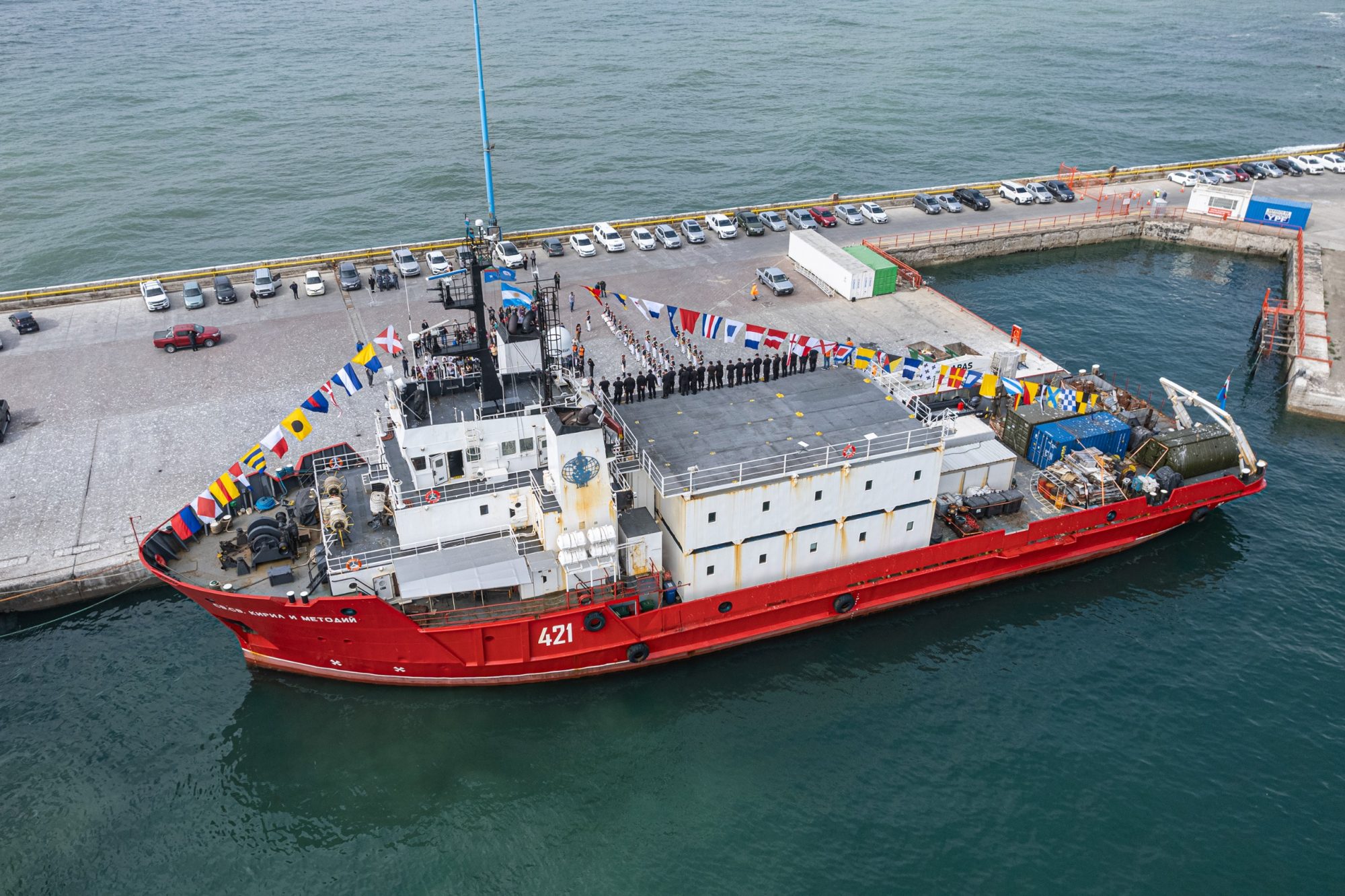 La embarcación se encuentra viajando con destino a la Antártida, a fin de cumplir una misión de investigación científica y las autoridades recibieron a su tripulación, encabezada por su capitán Nikolay Danailov; el almirante de la Armada búlgara, Boyan Mednikarov; el embajador de Bulgaria en Argentina, Stoyan Mihailov; el presidente del Instituto Antártico de Bulgaria, profesor Hristo Pimpirev; el director general de la Agencia de Noticias de Bulgaria, Kiril Valchev; la periodista de la Televisión Nacional de Bulgaria, María Cherneva; y el equipo de profesionales de investigación antártica.