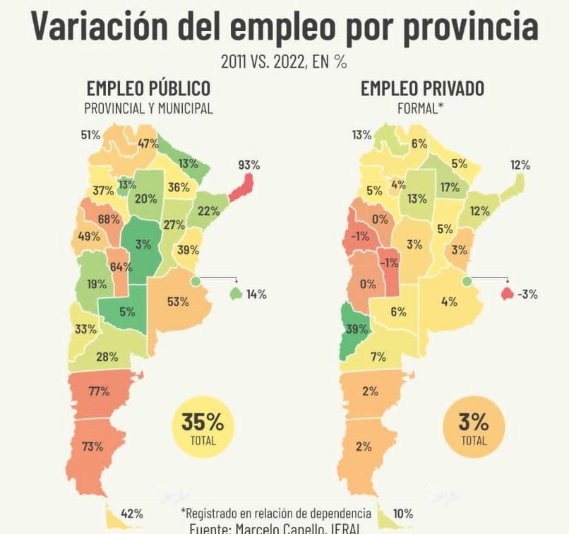 Entre 2011 y 2022 el crecimiento del empleo público en el país fue del 35%, contra el 3% que se registró dentro del sector privado, lo que pone en evidencia los desbalances que existen en la creación de trabajo que tiene la Argentina.