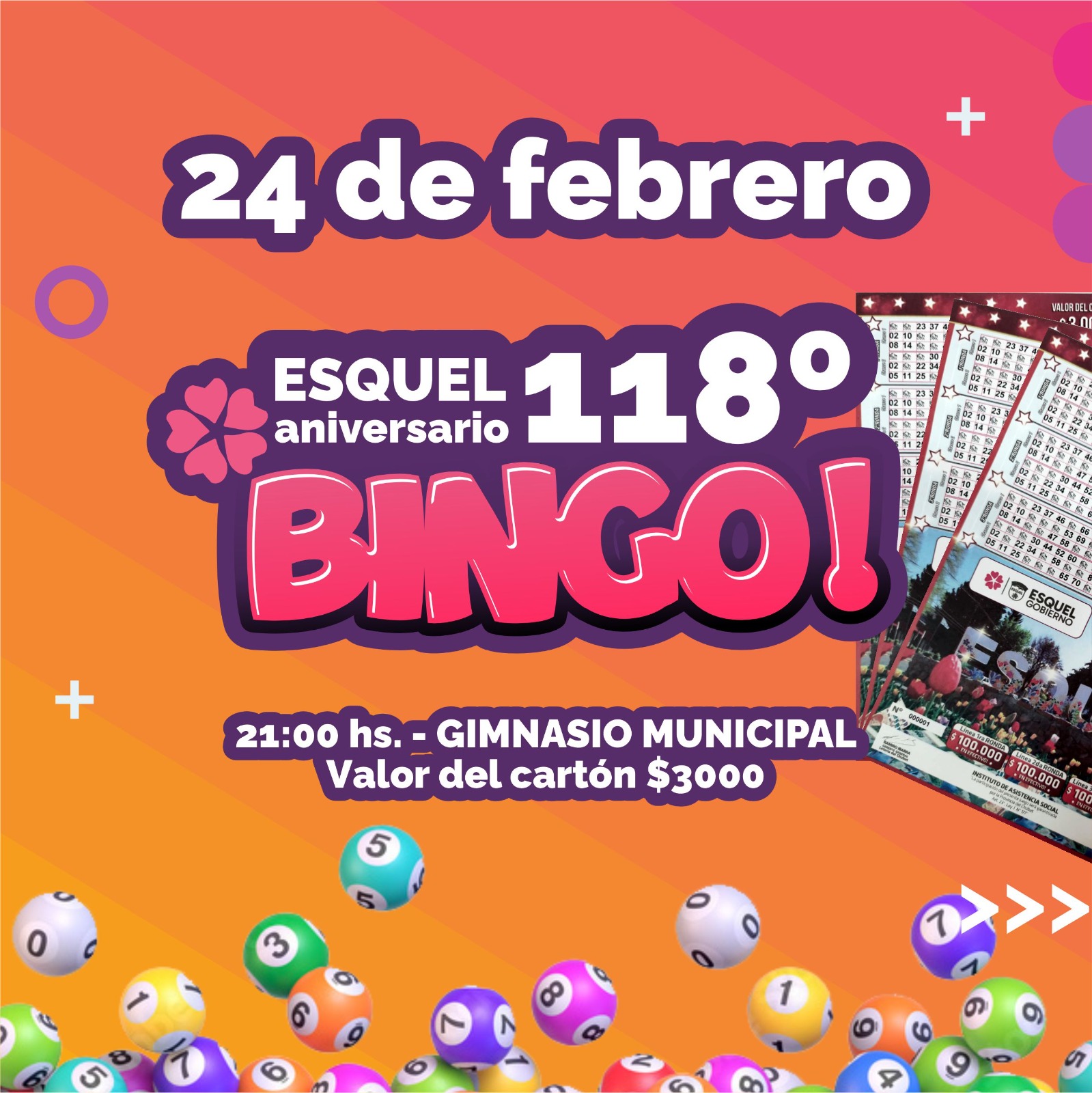 Los recitales son gratuitos. Sin embargo, cabe aclarar que tendrán prioridad de acceso al Gimnasio Municipal aquellas personas que cuenten con el cartón de bingo. El resto, ingresará por orden de llegada y sujeto a la capacidad máxima.