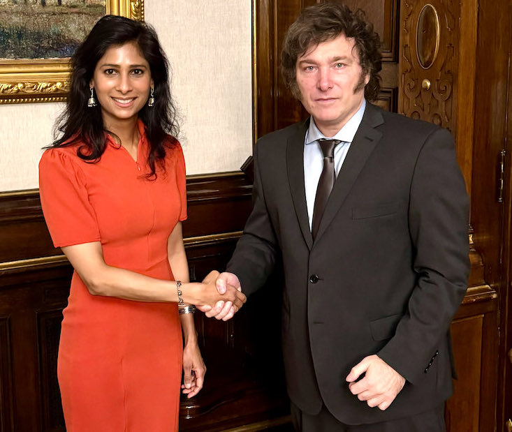 El encuentro se celebró al mediodía en la Casa Rosada y forma parte de una serie de reuniones que Gopinath mantuvo “con funcionarios del Gobierno y otras personas a fin de conocer los difíciles retos económicos y sociales de Argentina, así como su enorme potencial”, señaló el FMI a través de X.