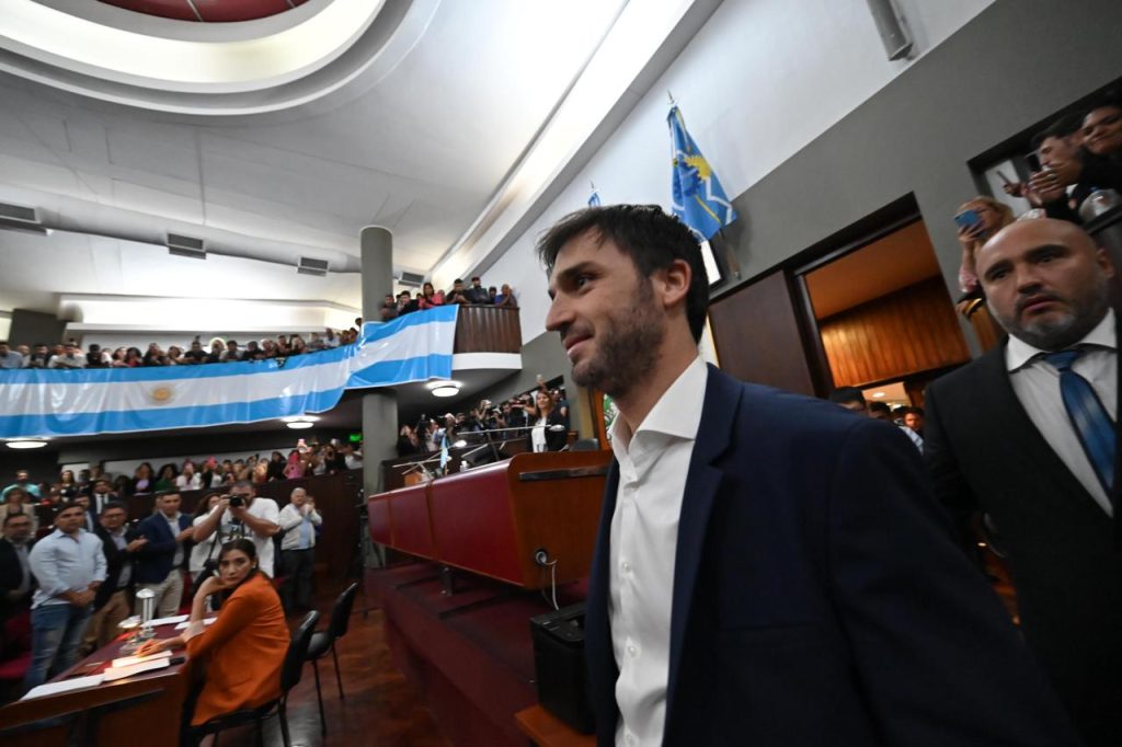 Torres ingresando al recinto para hablar ante diputados, intendentes y funcionarios provinciales.