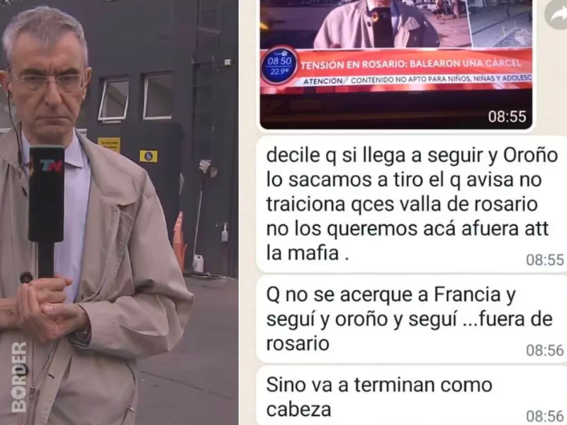 “Decile que si llega a Seguí y Oroño lo sacamos a tiro”, comienza la amenaza junto a una foto de la transmisión de TN en vivo donde se lo ve al conductor de Telenoche parado en una esquina de la ciudad. “El que avisa no traiciona. Que se vaya de Rosario, no los queremos acá”, sumaron junto a la firma “la mafia”.