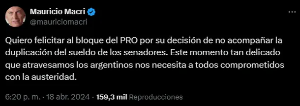 Luego del aumento excesivo en el salario de los senadores, el expresidente Mauricio Macri felicitó a los senadores que pertenecen al bloque del PRO por “su decisión de no acompañar la duplicación de su sueldo”.