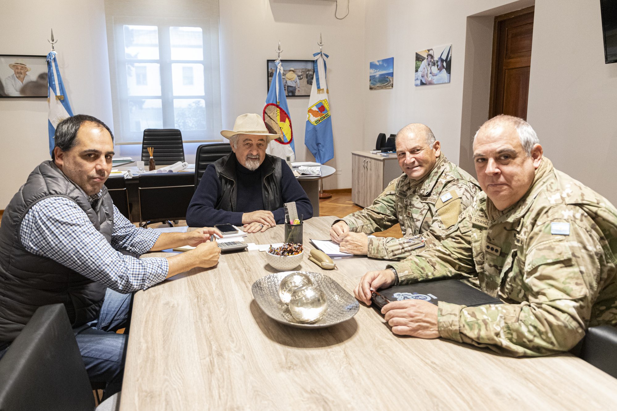 El intendente Othar Macharashvili junto al viceintendente Maximiliano Sampaoli, mantuvieron este jueves por la mañana en el despacho municipal, un encuentro protocolar con la plana mayor de la IX Brigada Mecanizada, coronel mayor Claudio Cervigni y el coronel Fernando Vivanco.