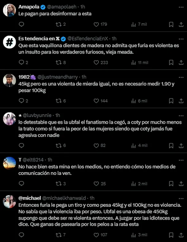 Tras viralizarse sus fuertes dichos, las redes sociales liquidaron a la periodista que parece estar completamente ajena a la realidad de esta edición del reality: “Le pagan para desinformar a esta”; “45kg pero es una violenta de mierda igual”; “Lo detestable que es la Ubfal, el fanatismo la cegó”; “No hace bien esta mina en los medios”; fueron sólo algunos de los comentarios de los internautas que también consumen Gran Hermano y se ven sorprendidos por el nivel de violencia de Furia que la producción no parece querer frenar.