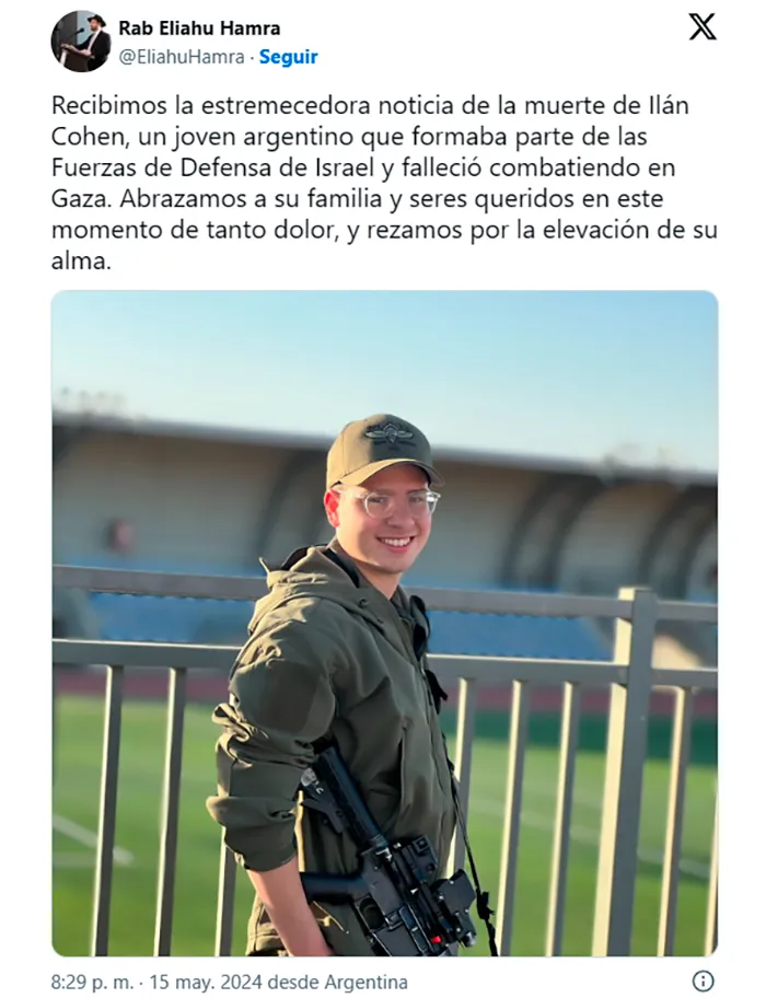 El rabino de AMIA, Eliahu Hamra, anunció la noticia ayer miércoles en su cuenta de X: “Recibimos la estremecedora noticia de la muerte de Ilán Cohen, un joven argentino que formaba parte de las Fuerzas de Defensa de Israel y falleció combatiendo en Gaza”.