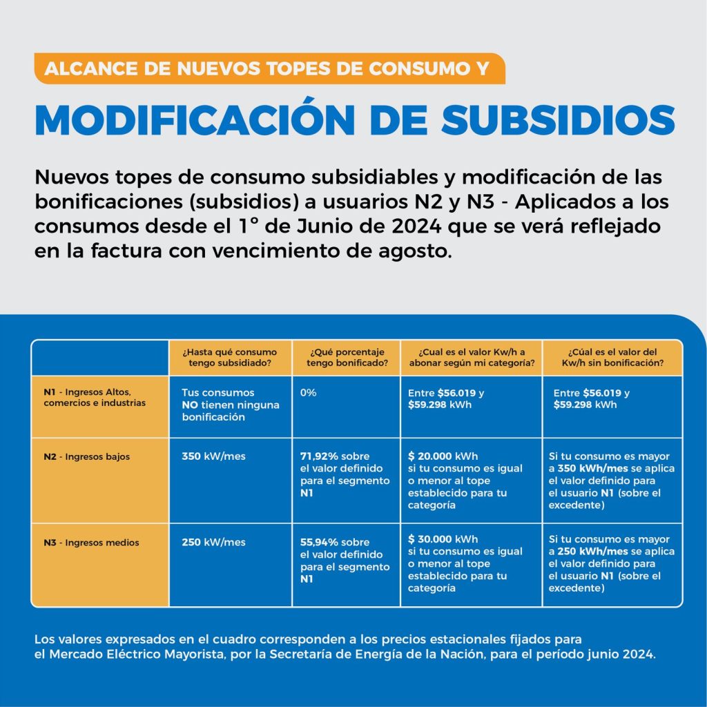 Especificó que “lo que cambió es que al N1 se le elimina completamente el subsidio. En el caso del N2, que no tenía tope, ahora va a tener un tope de consumo subsidiado, y para el N3 el tope cambia, ya que se bajó de 400 kv a 250 Kv. Es decir que tiene subsidio hasta los 250 Kv”.
