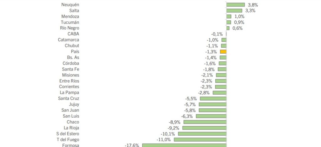 Por el contrario, 19 provincias registraron caídas interanuales, donde se destacan las de Formosa (-17,6%), Tierra del Fuego (-11,0%) y Santiago del Estero (-10,1%) que son las únicas provincias con descensos de doble dígito.
