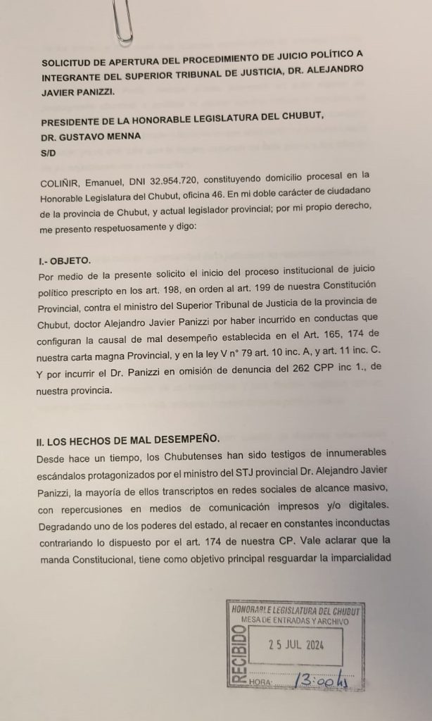 “Por medio de la presente solicito el inicio del proceso institucional de juicio político prescripto en los art. 198, en orden al art. 199 de nuestra Constitución Provincial, contra el ministro del Superior Tribunal de Justicia de la provincia de Chubut, doctor Alejandro Javier Panizzi por haber incurrido en conductas que configuran la causal de mal desempeño establecida en el Art. 165, 174 de nuestra carta magna Provincial, y en la ley V n° 79 art. 10 inc. A, y art. 11 inc. C”, sostiene el documento al que accedió en exclusiva Metadata Noticias.