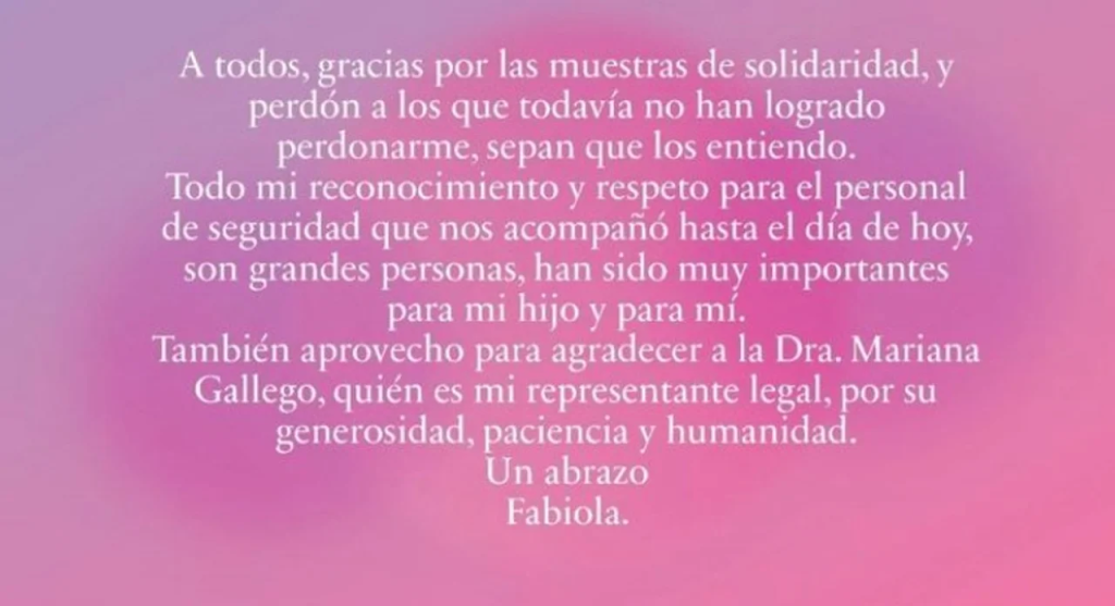 “Gracias por la solidaridad, entiendo a los que todavía no lograron perdonarme”, dice el mensaje de Fabiola Yañez en la red social.