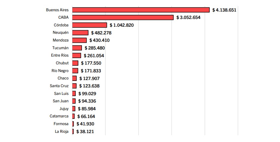 La provincia de Buenos Aires acumuló en los cuatro primeros seis del año 2024 un total de $ 4,1 billones en recaudación propia, CABA recaudó $ 3,1 billones y Córdoba $ 1 billón, siendo estos los tres distritos en superar el billón recaudado. Más atrás quedan Neuquén con $ 482.278 millones y Mendoza con $ 430.410 millones.