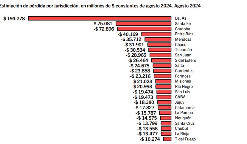 “A partir de las diferentes caídas reales observada por jurisdicción subnacional, se puede estimar la pérdida de recursos respecto al año anterior midiéndolos a precios de agosto 2024. Para el consolidado de provincias y CABA, la pérdida estimada es por $ 849.138 millones respecto a agosto 2023 y se detalla debajo el estimado para cada jurisdicción”, sostiene el informe al que tuvo acceso Metadata Noticias.