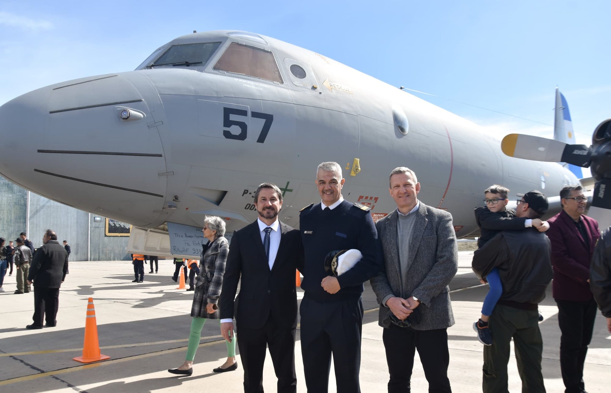 El intendente de Trelew, Gerardo Merino, participó este viernes de la presentación de la aeronave militar P3 Orion que, además de utilizarse para la vigilancia marítima, será para control, búsqueda y rescate en el Atlántico Sur.