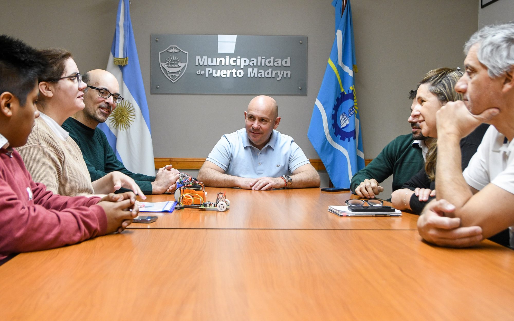 Al respecto, el Intendente dijo: “En un gran encuentro, recibimos en el Municipio a Aeron Figueroa y docentes de la Escuela Politécnica Nº 703 de Puerto Madryn, quienes nos brindaron detalles de la propuesta del Club de Robótica, un espacio de integración a través del cual se implementan nuevas tecnologías y herramientas. Nos parece una excelente iniciativa, por lo que los felicitamos y les ratificamos nuestro acompañamiento en todo lo que esté a nuestro alcance para que puedan seguir creciendo y formar parte de la Liga Nacional de Robótica.”.