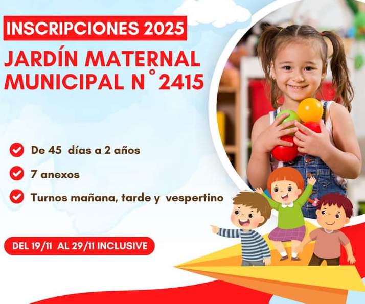 La Coordinación de Educación de Trelew informa que se habilitarán las inscripciones para el ciclo lectivo 2025 de los siete anexos del Jardín Maternal n.° 2415. Serán del 19 al 29 de noviembre, para niños y niñas desde los 45 días hasta los 2 años.