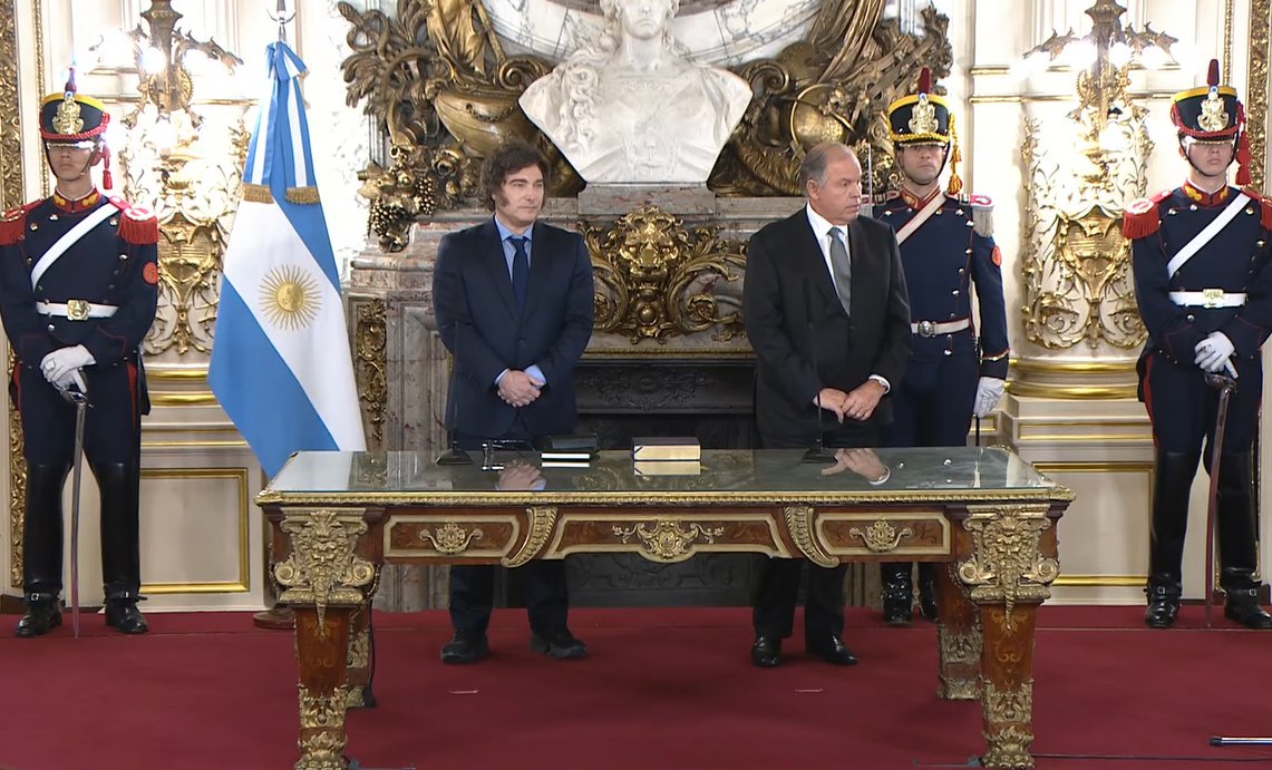 El exembajador en Estados Unidos juró en el Salón Blanco de la Casa Rosada por “dios, la patria y la torá”, tras la salida de Diana Mondino por votar en contra del bloque de Estados Unidos a Cuba. Luego de darle un abrazo al nuevo miembro de su gabinete, Milei aseguró: “Te mandan señales las fuerzas del cielo”.