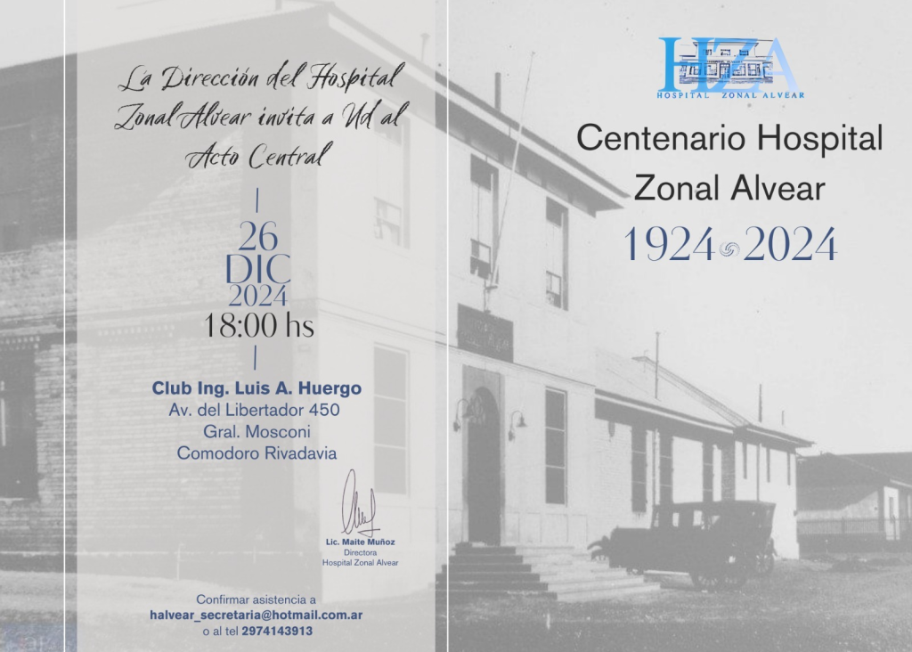 El Hospital Alvear de Comodoro Rivadavia cumplirá este 26 de diciembre 100 años de vida y de servicio junto a la comunidad. Es el primer hospital de complejidad de la Patagonia y formador de enfermeros e instrumentadores quirúrgicos.