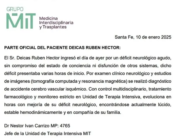 “El Sr. Deicas Ruben Hector ingresó el día de ayer por un déficit neurológico agudo, sin compromiso del estado de conciencia ni disfunción de otros sistemas, dicho déficit presentaba varias horas de inicio”, indica el reporte médico difundido por el sanatorio de Medicina Interdisciplinaria y Trasplantes (MIT) de Santa Fe.