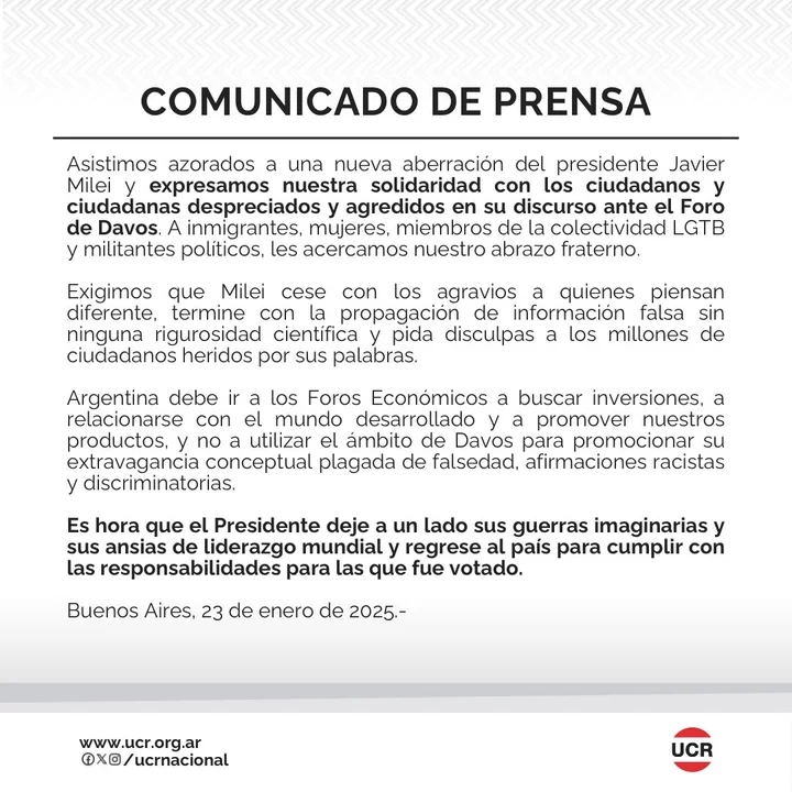 “Asistimos azorados a una nueva aberración del presidente Javier Milei y expresamos nuestra solidaridad con los ciudadanos y ciudadanas despreciados y agredidos en su discurso ante el Foro de Davos. A inmigrantes, mujeres, miembros de la colectividad LGBT y militantes políticos, les acercamos nuestro abrazo fraterno“, reza el comunicado en su inicio.