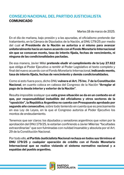Por último, el documento concluye con un rechazo categórico: “El Partido Justicialista Nacional rechaza en todos sus términos el DNU 179/25 y cualquier operación de crédito con el FMI que se realice violando el sistema normativo nacional y a espaldas del pueblo argentino”.