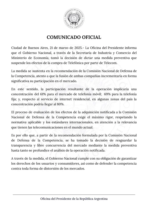 El Gobierno suspendió preventivamente la compra de Telefónica por parte de Telecom, tras un dictamen de la Comisión Nacional de Defensa de la Competencia que advirtió un riesgo de concentración del mercado en el sector de telecomunicaciones.