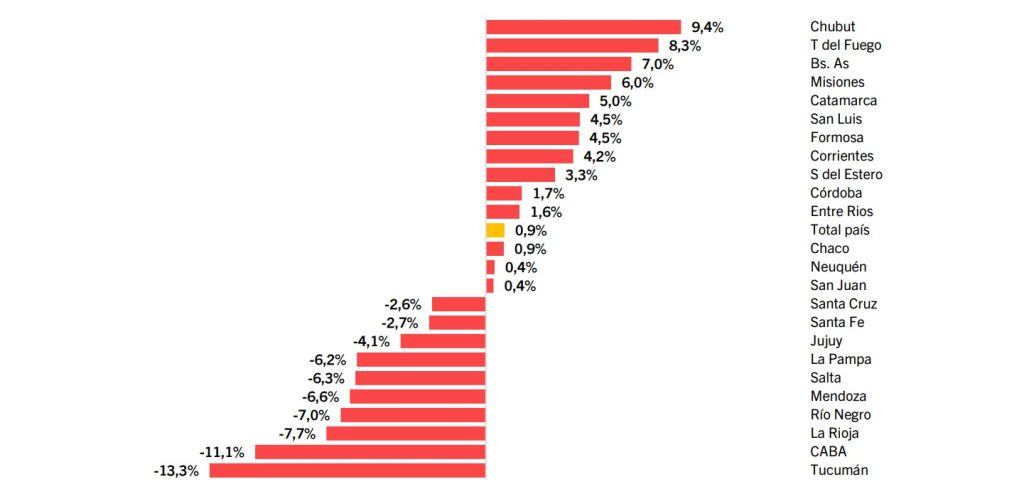En marzo de 2025, 14 de las 24 jurisdicciones subnacionales presentaron subas interanuales: lideraron Chubut (9,4%), Tierra del Fuego (8,3%) y Buenos Aires (7,0%).