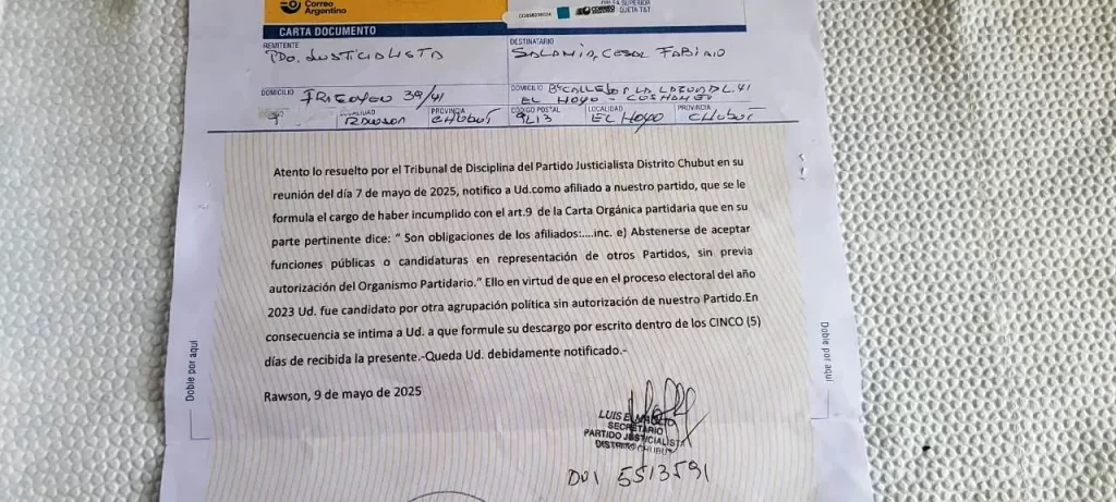 Uno de ellos es el alcalde de El Hoyo, César Salamín, quien ya recibió la carta documento del PJ por haber participado en la última contienda electoral por el espacio que lideró Ignacio Torres.
