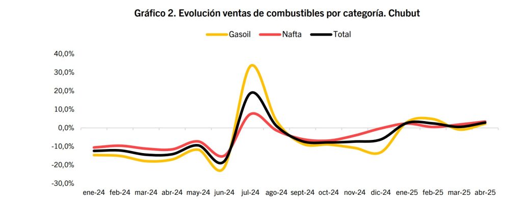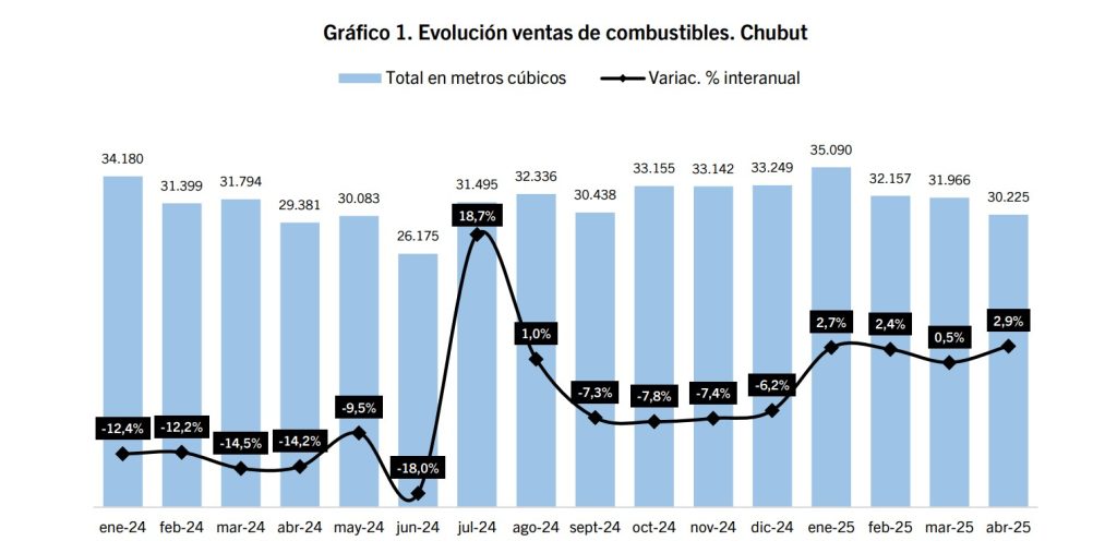 Con este incremento interanual, Chubut suma cuatro meses consecutivos de recuperación en ese nivel comparativo; sin embargo, si la medición se hace de manera mensual, viene sosteniendo menores niveles de venta desde enero a abril.