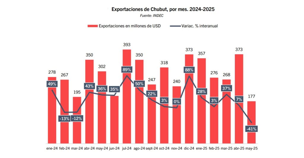 La provincia de Chubut registró exportaciones durante el mes de mayo de 2025 por u$s 177 millones, el valor mensual más bajo desde junio de 2023 y que equivale a una fuerte caída respecto a igual mes del año pasado (-41,3%). Sin embargo, en el acumulado de los primeros cinco meses, las ventas al exterior son las más altas desde 2002.