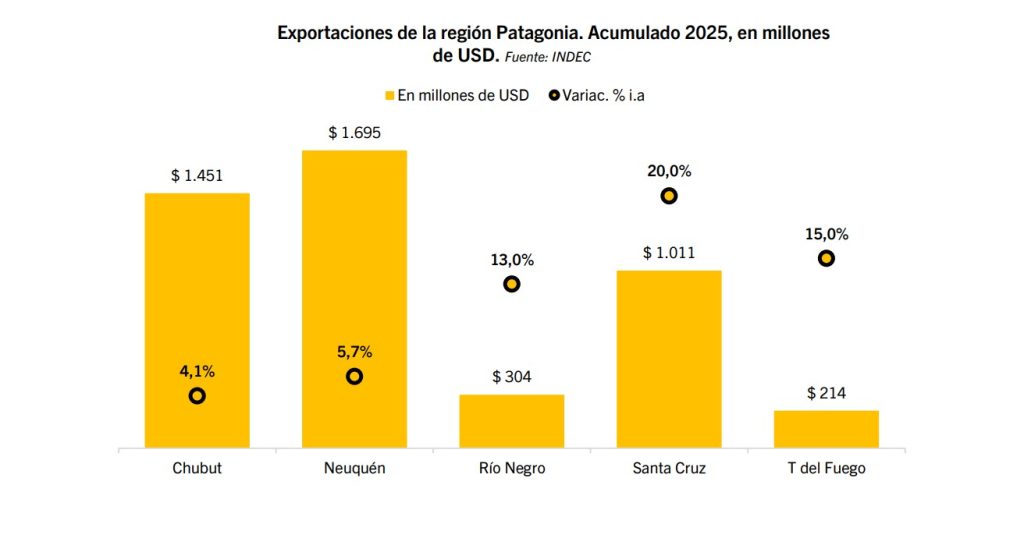 En el plano regional, Chubut se posiciona como la segunda provincia más exportadora de la Patagonia, concentrando el 31% del total regional, quedando solamente por debajo de Neuquén que concentró el 36% de las exportaciones patagónicas. Sin embargo, fue la provincia con la variación interanual más leve en la región.
