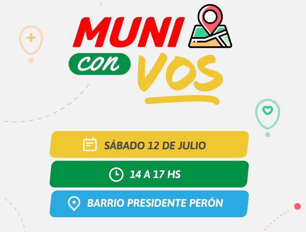 Este sábado 12 de julio, de 14 a 17, se realizará una nueva edición del programa “Muni con Vos” en la sede vecinal del barrio Presidente Perón, ubicada en Rivadavia norte 418.