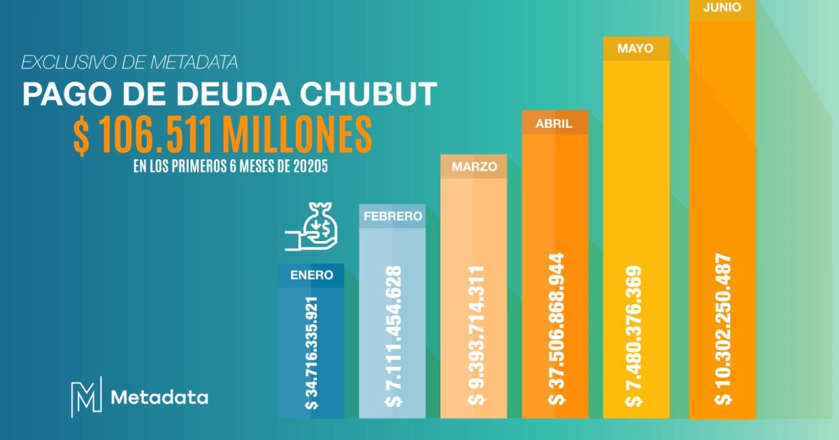 En este informe exclusivo de Metadata Noticias, te mostramos cuánto pagó en el primer semestre de 2025 la provincia del Chubut en concepto de deuda, con un desglose mes a mes. El Gobierno de Ignacio Torres pagó entre enero y junio de este año por colocaciones emitidas en las gestiones de los exgobernadores Mariano Arcioni … Sigue leyendo Hemorragia financiera: Chubut pagó $ 106.511 millones de deuda en el primer semestre del año
