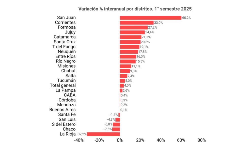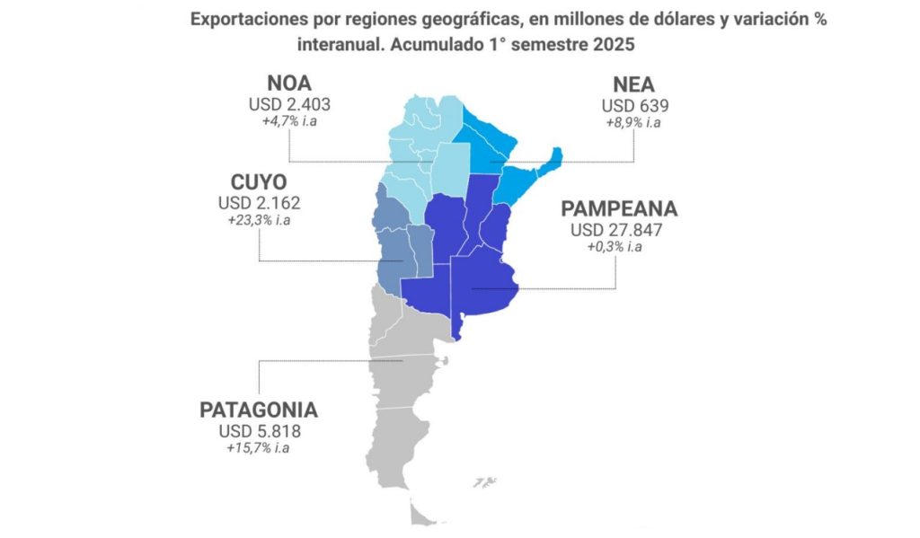 En el cuarto lugar de la región patagónica, se posicionó La Pampa con ventas al exterior por 553 millones de dólares y el top five lo cerró Río Negro con u$s 372 millones durante el primer semestre de 2025.