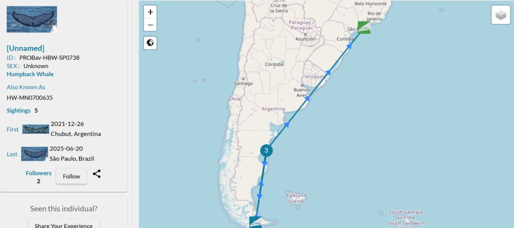 En la costa de Chubut, el Parque Patagonia Azul mantiene un catálogo propio que permite saber cuántos individuos visitaron la zona, en qué épocas, cuánto tiempo permanecieron y con quiénes interactuaron. Pero al sumar esa información a HappyWhale, los registros se enlazan con los de otras regiones del mundo.
