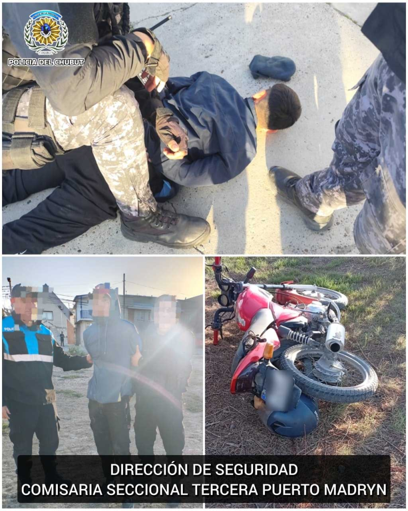 Este jueves alrededor de las 18:20, el Centro de Monitoreo de Puerto Madryn alertó a la Comisaría Tercera sobre dos individuos que llevaban a la rastra una motocicleta en la intersección de Lewis Jones y avenida Roca.