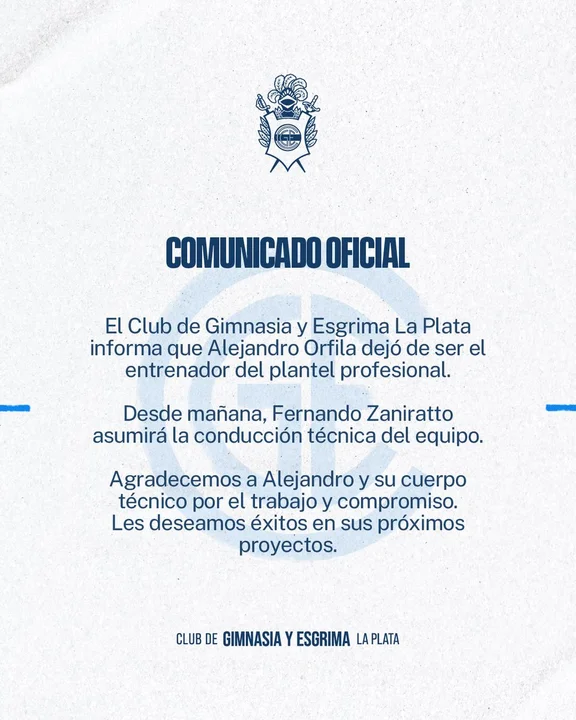 El Club de Gimnasia y Esgrima de La Plata informa que Alejandro Orfila dejó de ser el entrenador del plantel profesional. Desde mañana, Fernando Zarinatto asumirá la conducción técnica del equipo. Agradecemos a Alejandro y su cuerpo técnico por el trabajo y compromiso. Les deseamos éxitos en sus próximos proyectos.