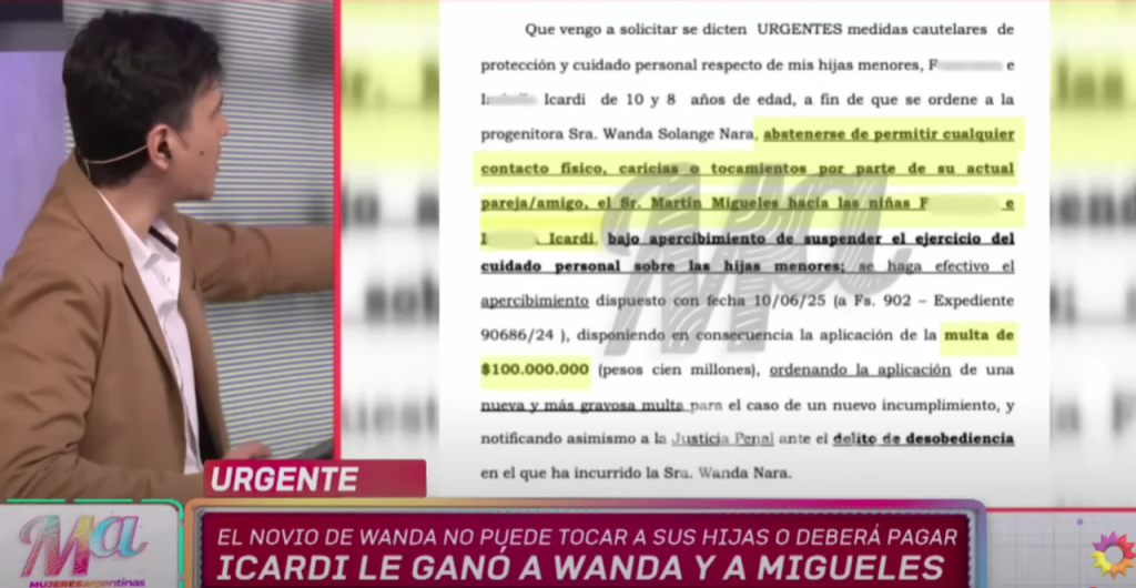 “Que vengo a solicitar se dicten URGENTES medidas cautelares de protección y cuidado personal respecto de mis hijas menores, F e I Icardi de 10 y 8 años de edad, a fin de que se ordene a la progenitora Sra. Wanda Solange Nara, abstenerse de permitir cualquier contacto físico, caricias e tocamientos por parte de su actual pareja/amigo, el Sr. Martín Migueles hacia las niñas F I Icardi bajo apercibimiento de suspender el ejercicio del cuidado personal sobre las hijas menores; se haga efectivo e apercibimiento dispuesto con fecha 10/06/25 (a Fs. 902 Expediente 90686/24), disponiendo o en consecuencia la aplicación de la multa de $100.000.000 (pesos cien millones), ordenando la aplicación de una nueva y más gravosa multa para el caso de un nuevo incumplimiento, y notificando asimismo a la Justicia Penal ante el delito de desobediencia en el que ha incurrido la Sra. Wanda Nara”, indicaba el documento presentado por las abogadas de Icardi.
