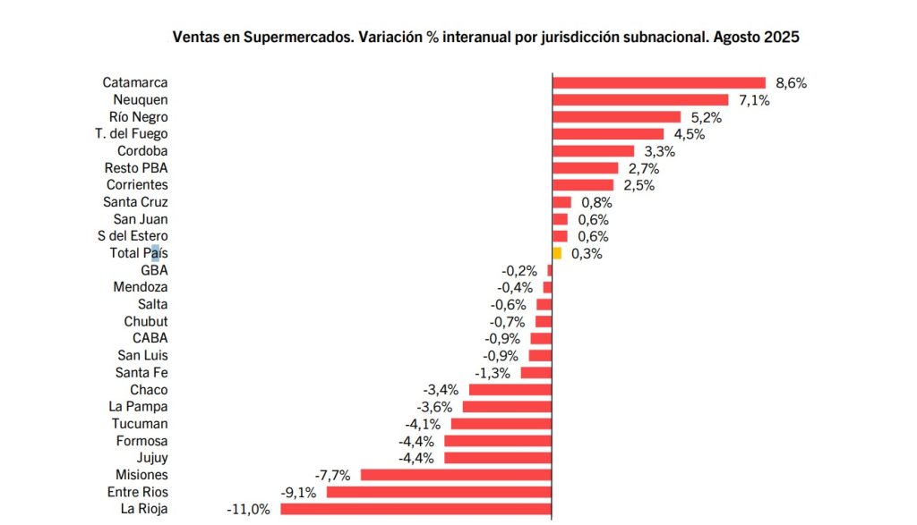 Solo nueve provincias registraron alzas en las ventas en supermercados durante agosto de 2025: Catamarca, Neuquén, Río Negro, Tierra del Fuego, Córdoba, Corrientes, Santa Cruz, San Juan y Santiago del Estero.
