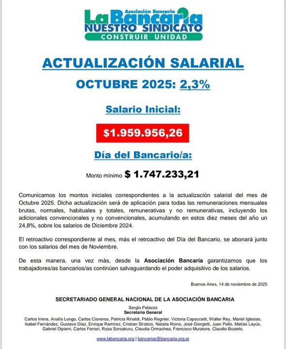 La Asociación Bancaria comunicó la actualización salarial del 2,3% correspondiente a octubre, que queda con un salario inicial de $1.959.956,26 y se ubica en línea con la inflación de ese mes.