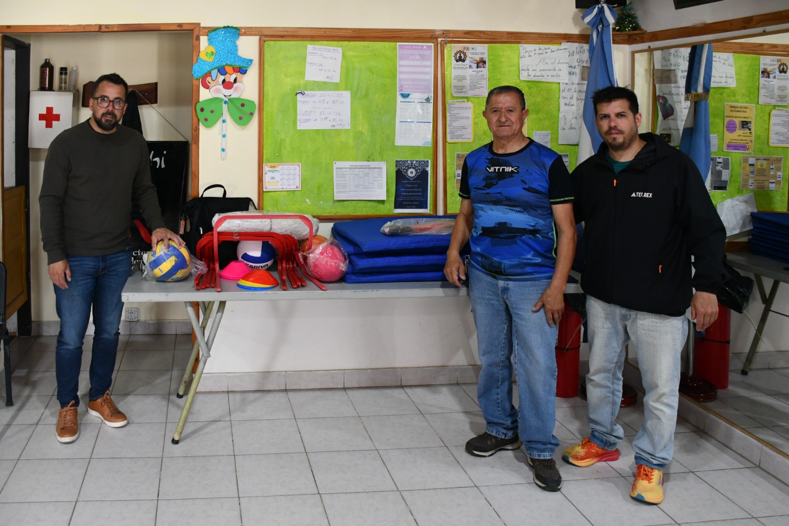La sede vecinal del barrio Jorge Newbery recibió este miércoles una serie de elementos deportivos destinados a fortalecer las actividades que allí se desarrollan, especialmente los talleres de gimnasia para adultos que funcionan los miércoles y viernes. La entrega estuvo encabezada por el subsecretario de Deportes, Hernán Maciel, y el presidente de la sede vecinal, Pedro Manosalva, quienes además anunciaron nuevas obras para el espacio comunitario.