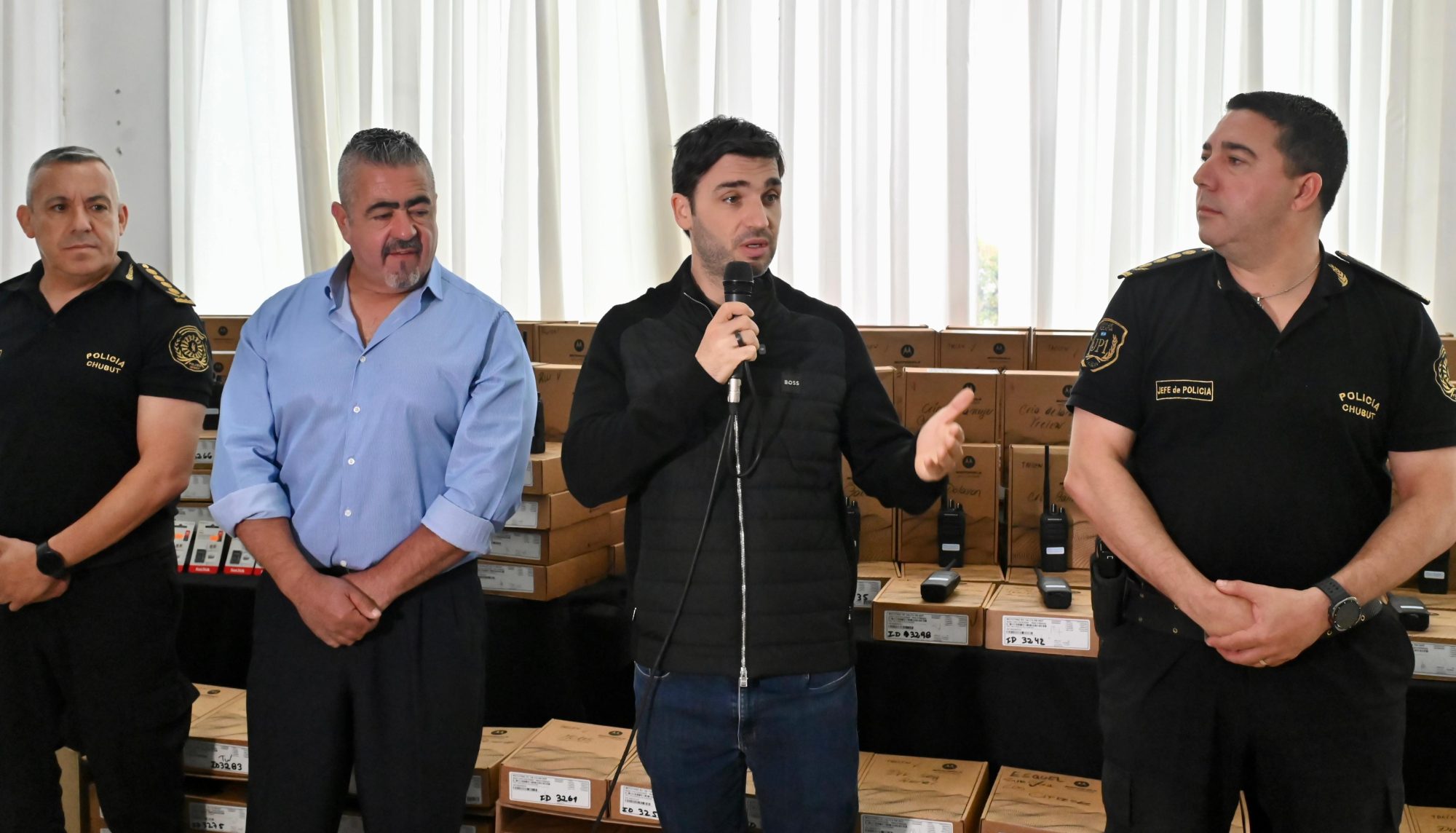 Concretamente, en la ceremonia se hizo entrega de 385 equipos de comunicación de mano (HT), adquiridos mediante una inversión de 245.044.800 pesos. Se trata de una compra sin precedentes que contempla la provisión de nuevos aparatos a las dependencias policiales de las Unidades Regionales de Trelew y Esquel, lugares que no renuevan este equipamiento desde hace aproximadamente 20 años.
