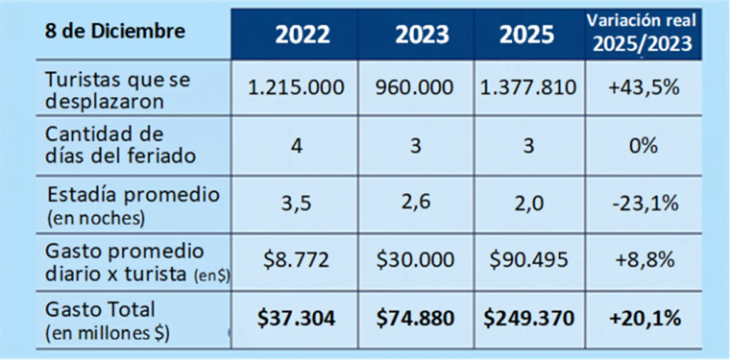 El último fin de semana largo del 2025, otorgado por el Día de la Inmaculada Concepción, trajo consigo un aumento en la cantidad de turistas que recorrieron el país y un gasto total de $249.370 millones, mientras que la estadía promedio bajó.