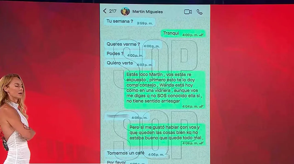 “Querés verme? Podés? Quiero verte”, insistió Migueles en el supuesto chat. “Estás loco Martín, vos estás re expuesto, primero esto te lo doy como consejo, Wanda está hoy en una vidriera, aunque vos me digas que no sos conocido, ella sí. No tiene sentido arriesgar”, le respondió ella.